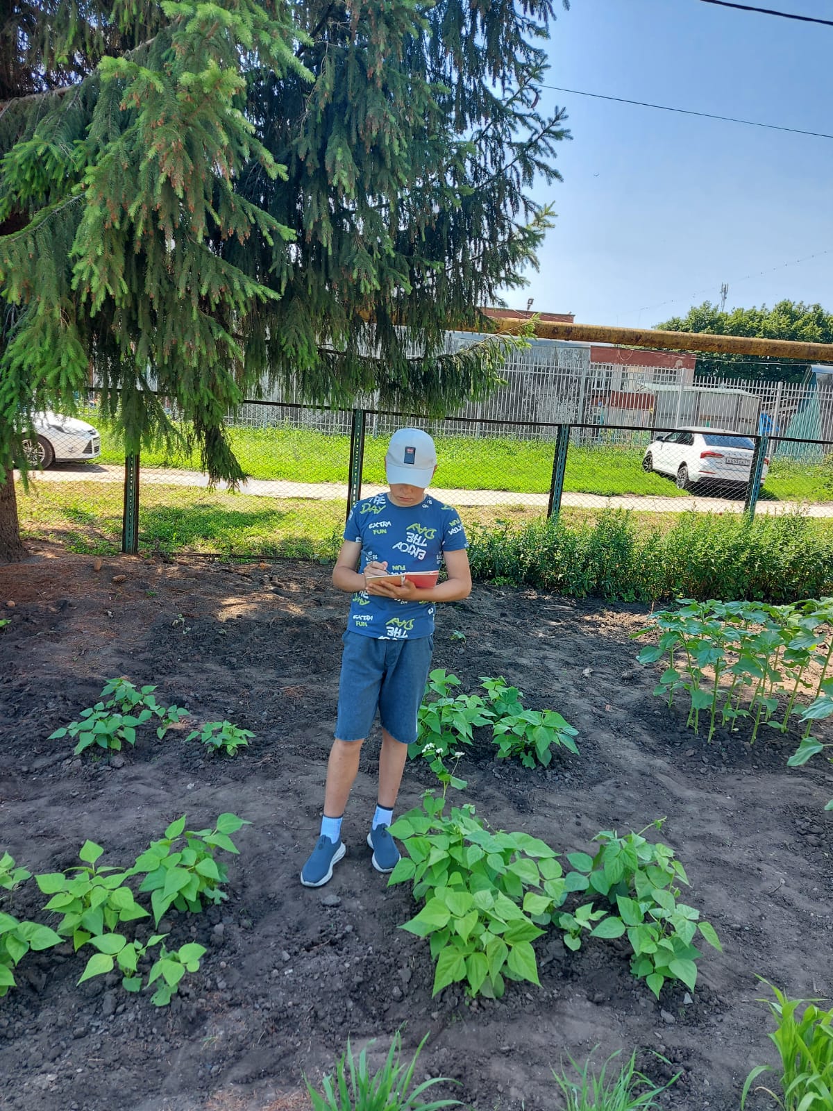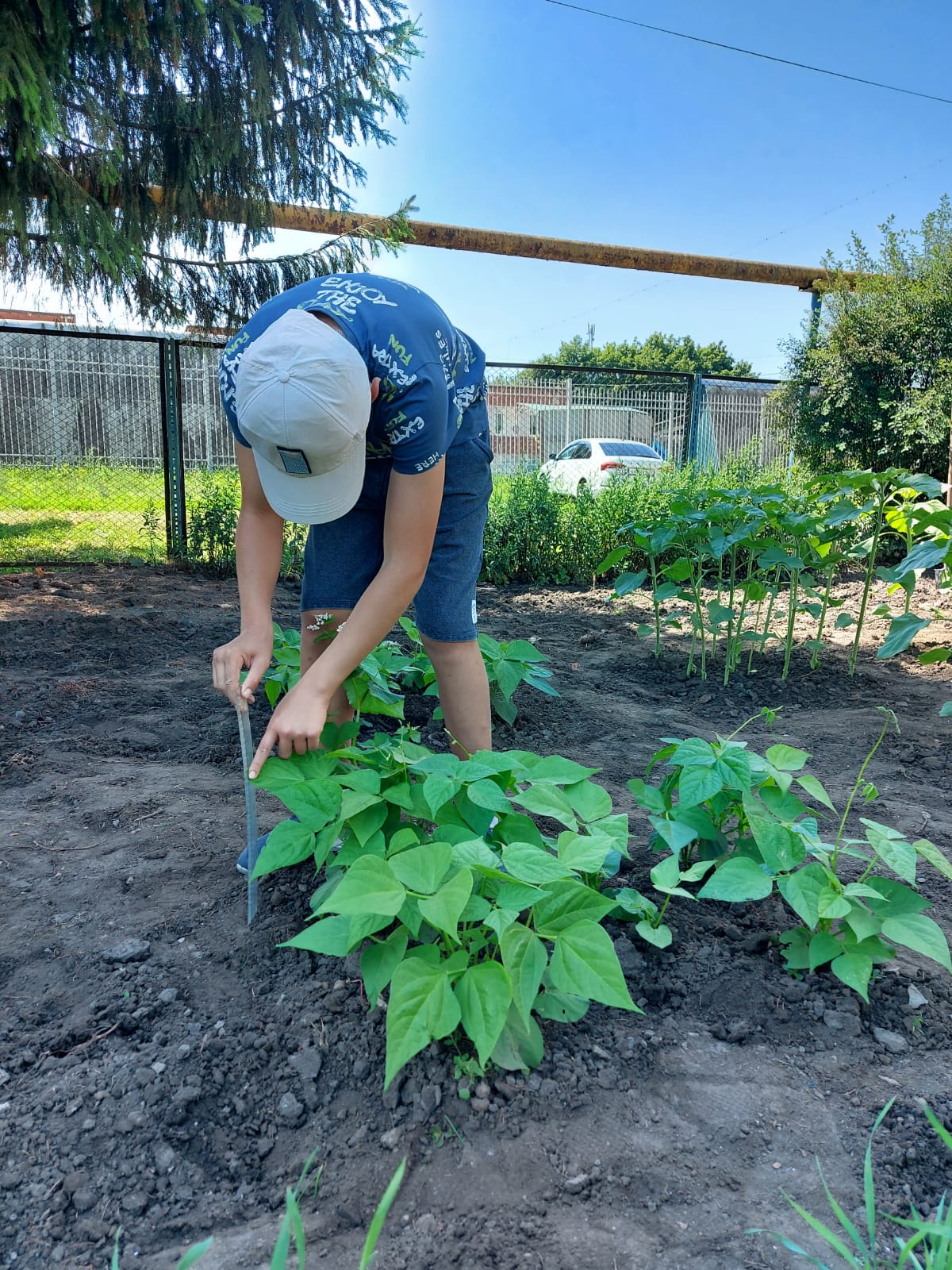 Обучающиеся объединения "Юный краевед" в летний период работают на учебно-опытном участке. Они проводят сортоиспытание трёх разновидностей фасоли.